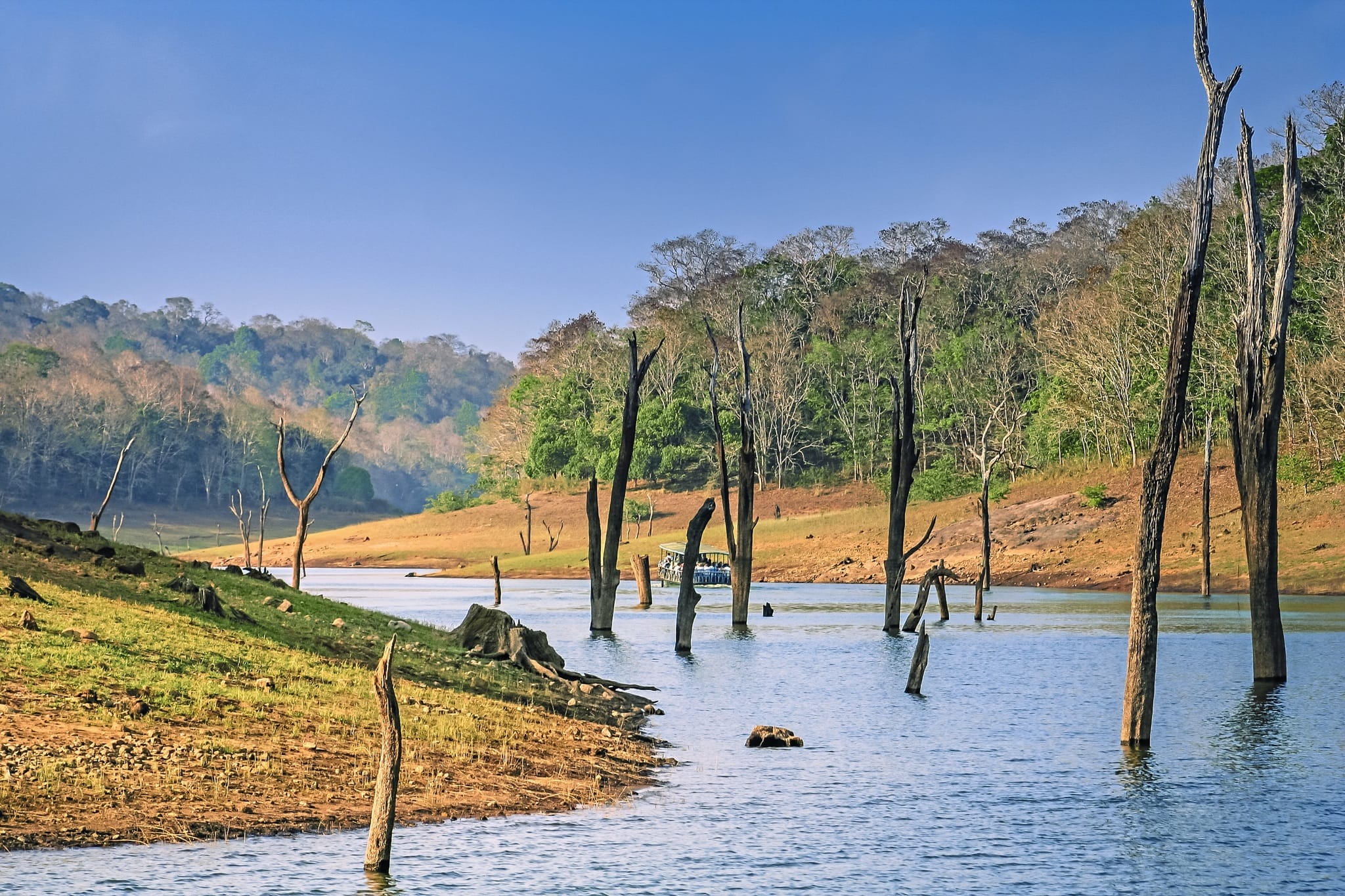 Am Nachmittag erwartet Sie ein Höhepunkt: eine Bootsfahrt auf dem Periyar-See. Diese entspannte Fahrt führt Sie tief in den Dschungel und bietet Ihnen eine einzigartige Gelegenheit, die vielfältige Tierwelt in ihrer natürlichen Umgebung zu beobachten. Halten Sie Ausschau nach majestätischen Elefanten, imposanten Bisons, eleganten Hirschen und mit etwas Glück sogar nach einem scheuen Tiger. Kleinere Bewohner wie der schwarze Nilgiri-Langur, Hutaffen, Löwenschwanzmakaken sowie Riesen- und Flughörnchen sind ebenfalls zu entdecken. Über 246 Vogel- und 112 Schmetterlingsarten machen die Luft zu einem lebendigen Schauspiel, während Sie an mehr als 100 Jahre alten und über 50 Meter hohen Bäumen vorbeigleiten.