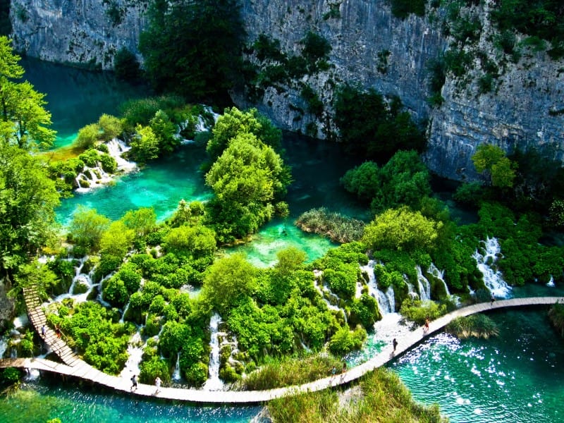 Sie starten den Tag mit einem Spaziergang durch den Nationalpark, vorbei an plätschernden Wasserfällen. Das hervorragend erhaltene Naturschutzgebiet umfasst jahrhundertealte Wälder, Quellen, Wasserläufe sowie 16 blaugrüne, kristallklare Seen, die miteinander durch stufenförmige Wasserfälle verbunden sind. Sie sind kaskadenförmig und in Fliessrichtung angeordnet, getrennt von natürlichen Barrieren, die sich jederzeit verändern können. Dadurch wandelt sich das Bild der Seen regelmässig.