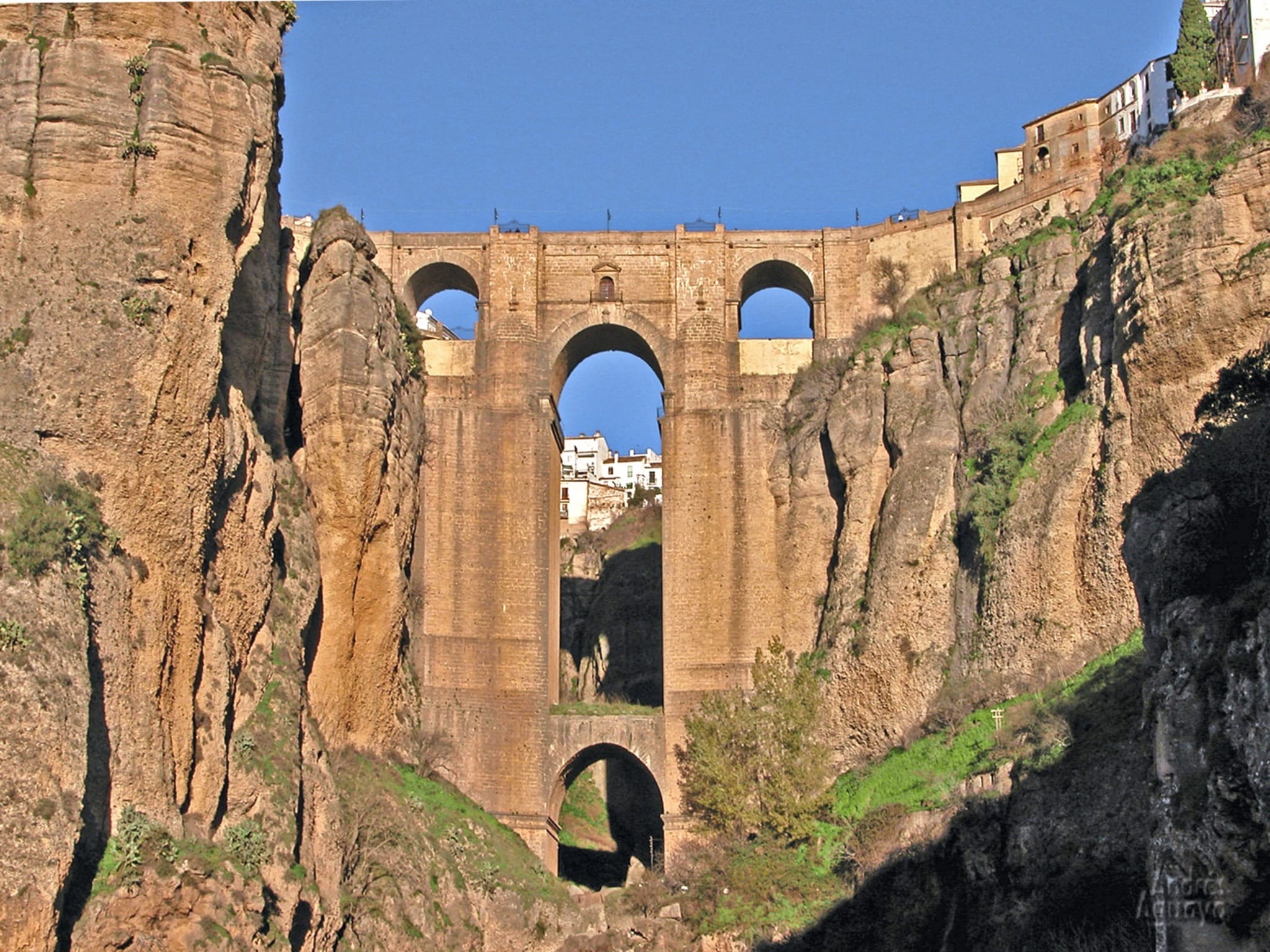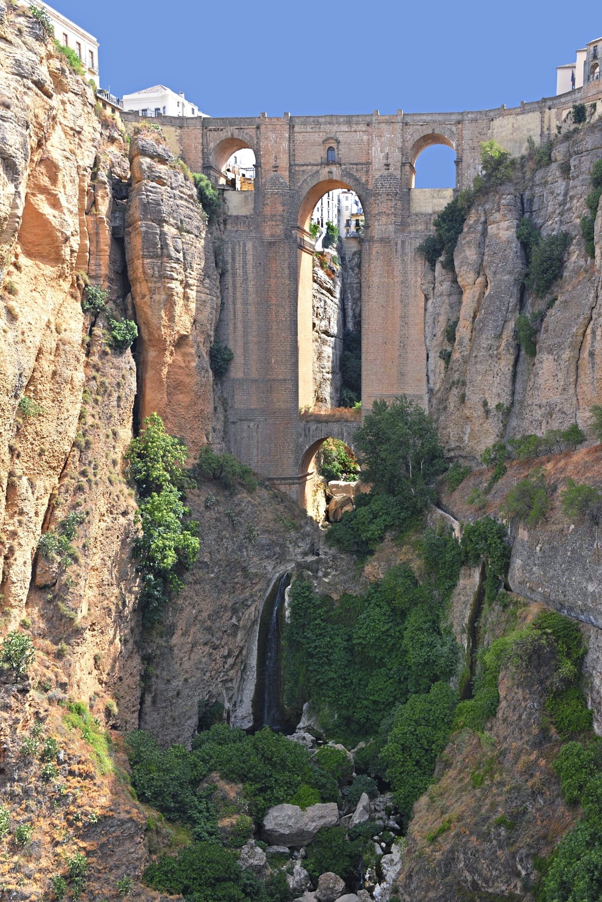Die Stadt, welche früher aufgrund ihrer hervorragenden Lage auf einem Felsplateau als uneinnehmbar galt und auf einer Höhe von 723 m über dem Meeresspiegel liegt, besticht durch ihre wunderschöne, mit Kopfsteinpflaster ausgestattete Altstadt. Die Neu- und Altstadt werden durch die beeindruckende Puente Nuevo – die neue Brücke – verbunden. Diese einzigartige Brücke wurde im 18. Jahrhundert erstellt und erstreckt sich in einer Höhe von 120 Meter über die Schlucht El Tajo. Sie gilt als Wahrzeichen der Stadt. Bauherr war der Spanier José Martín de Aldehuela. Um ihn rankt sich die Legende, er habe sich nach der Fertigstellung des Puente Nuevo von deren Höhe ins Tal hinab in den Tod gestürzt, weil er sich sicher war, nie mehr in seinem Leben eine solche architektonische Meisterleistung von majestätischer Schönheit zu bauen. Ob was dran ist, das lässt sich nicht endgültig klären. Weitere bekannte Sehenswürdigkeiten der Stadt sind die Stiftskirche Santa Maria la Mayor, die Stierkampfarena Rondas, eine der ältesten Europas, und das Adelhaus Don Bosco. Der modernistische Palast wurde Anfang des 20. Jahrhunderts gebaut und besitzt Beispiele der regionalen Keramikkunst.