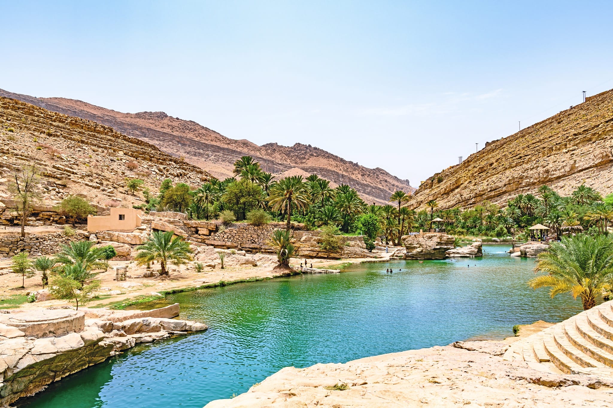 Weiter führt die Reise nach Wadi Shab, einem der bekanntesten und beeindruckendsten Naturwunder Omans. Nach einer kurzen Überfahrt mit einem kleinen Motorboot über die Lagune beginnt Ihre Wanderung in eine spektakuläre Schlucht, die sich zwischen hohen, hellen Kalksteinfelsen öffnet. Der Weg führt entlang natürlicher Wasserläufe, Palmenhainen und kleinen Becken, in denen das türkisfarbene Wasser klar und einladend schimmert. Die Landschaft wechselt zwischen offenen, sonnenbeschienenen Flächen und schmalen Passagen, in denen die Felswände eng aneinander stehen und für angenehmen Schatten sorgen.