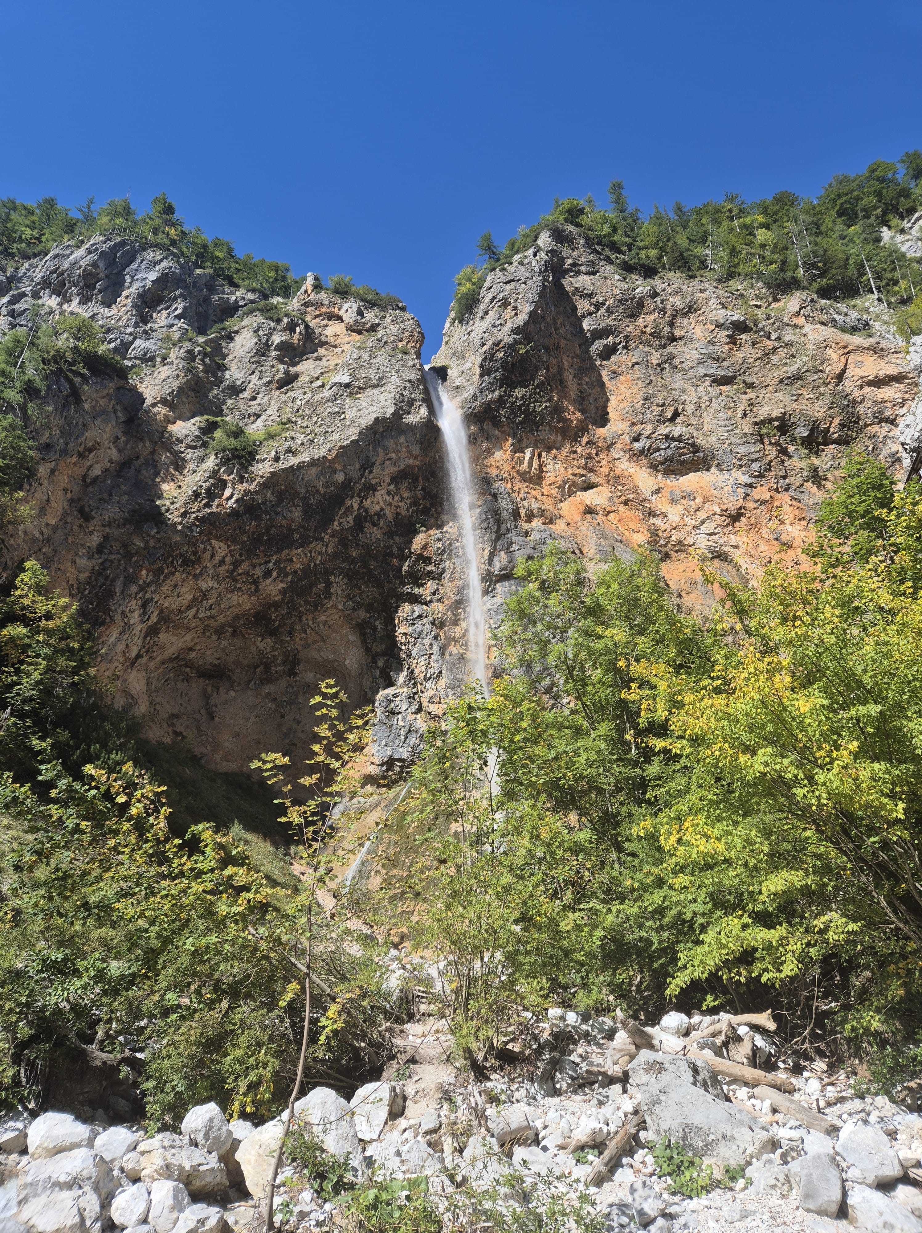 Einen herrlichen Vormittag verbringen wir im idyllischen Logar-Tal. Die kurvenreiche Fahrt dorthin öffnet immer wieder den Blick auf farbig leuchtende Wälder und steile Felswände, bis wir schliesslich den Ausgangspunkt zum Rinka-Wasserfall erreichen. Ein etwa 20-minütiger Wanderweg führt uns zum Wasserfall.