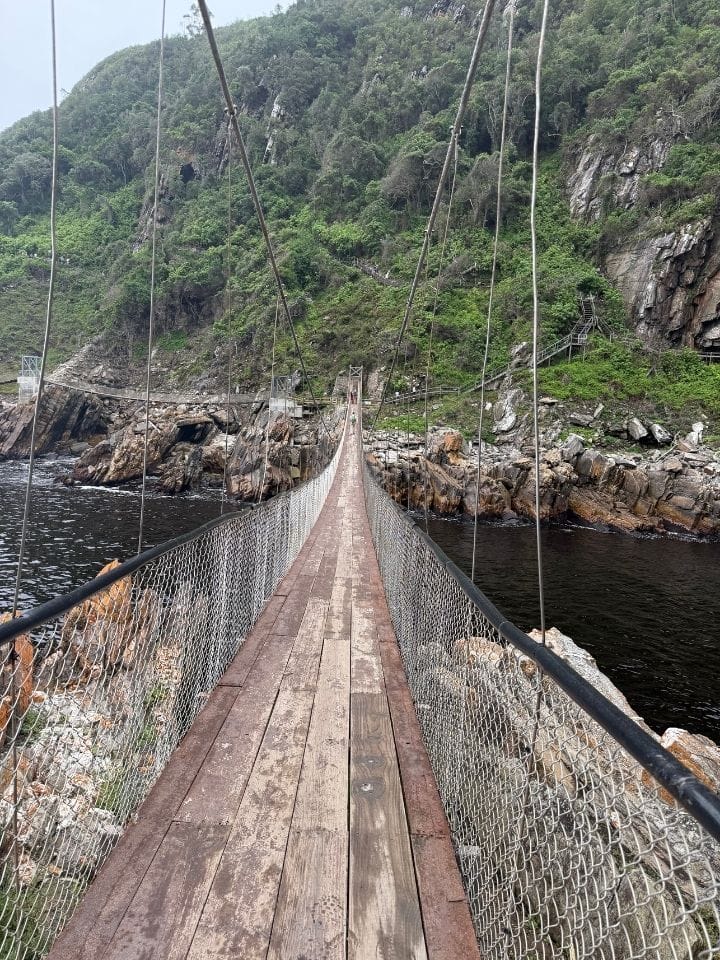 Weiter ging’s in den Tsitsikamma Nationalpark. Nach einer Übernachtung in der Tsitsikhaya Lodge unternahmen wir frühmorgens die kurze Wanderung zur berühmten Storms River Hängebrücke. Hier lohnt sich auch die anspruchsvollere Route zum Wasserfall – diese werden wir bei unserem nächsten Besuch machen.